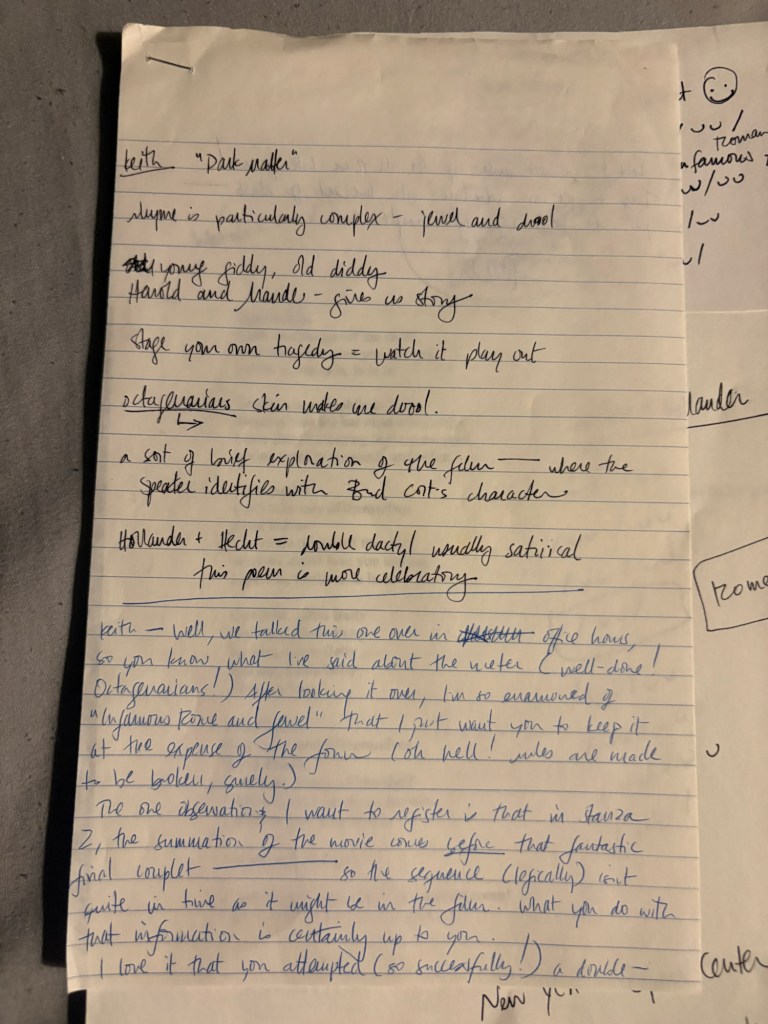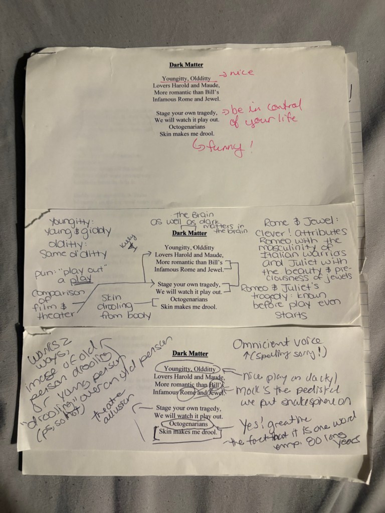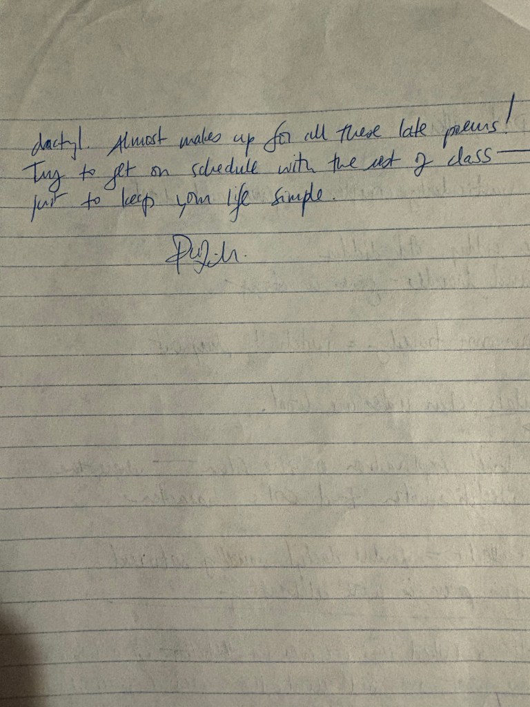 Going through my old notebook I found these comments from my classmates, reminders of the good times and discussions we had in Professor Susan L. Miller’s class. My biggest score is her feedback on this one! A reminder of why she is hands down my favorite professor I had in college. Professors like her are lifesavers!!! From personal experience both in person and from her poetry book “Communion of Saints”, I think it’s okay to publicly note she is guided by the ultimate life and soul saver, the Lord and Savior. Lately, after seeing my brother mentor a new generation in hockey I’ve been thinking about going back to school to become a creative writing teacher.
