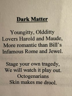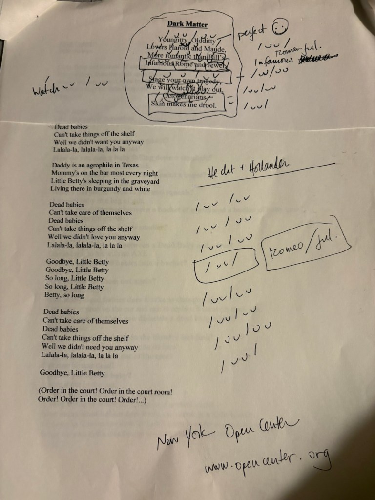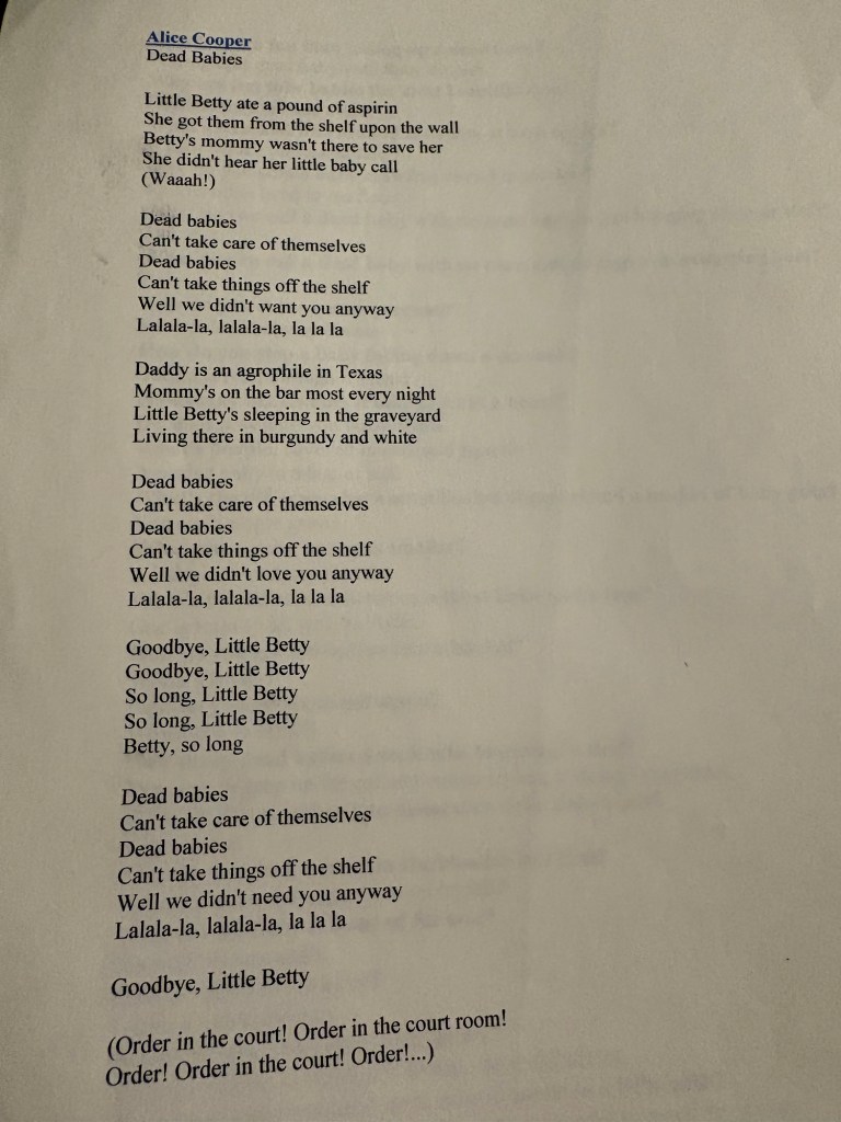 When I handed this poem out I also attached the lyrics to rock n roll’s Vincent “Alice Cooper” Furnier’s song “Dead Babies”. More “dark matter”. More Tim influence. I had once see him perform this song at a karaoke bar in North Brunswick, NJ. He followed it later in the night with Glen Campbell’s “Like A Rhinestone Cowboy”. That was Tim’s sense of humor.