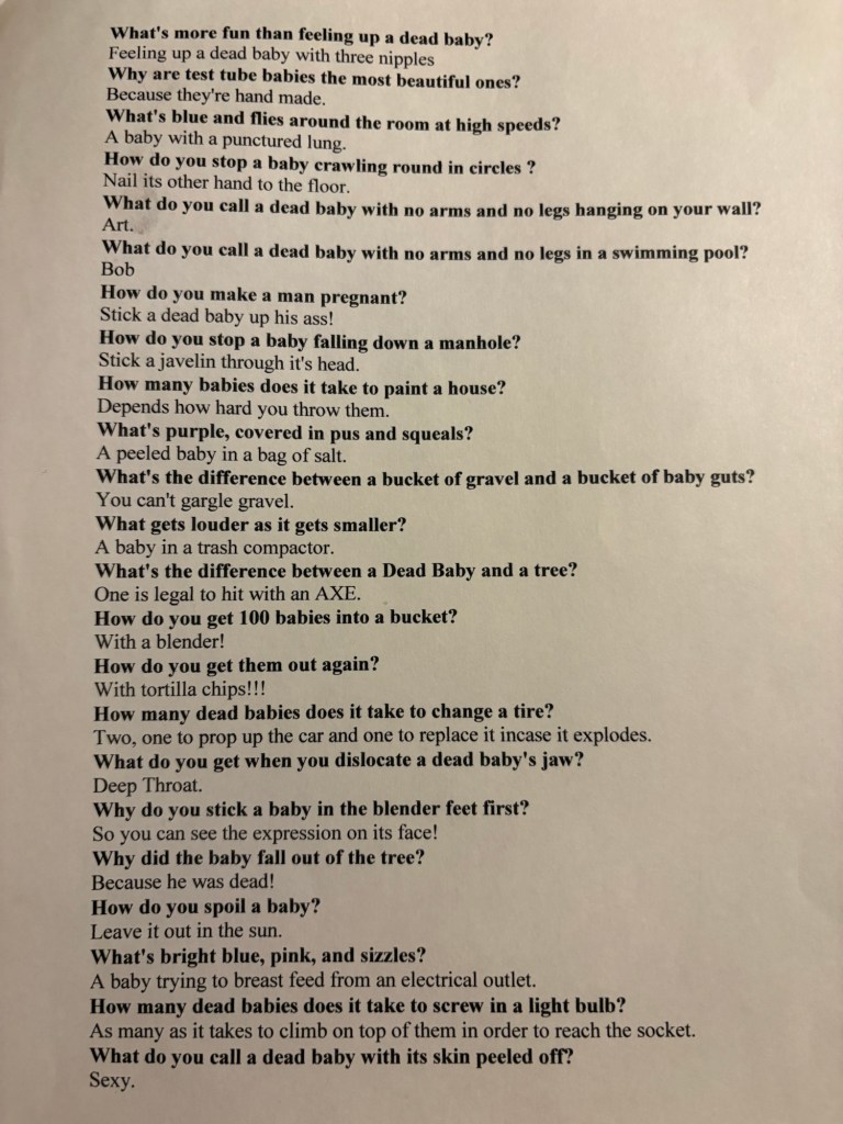 To keep the “dark matter” theme going I also passed out this list of “dead babies jokes”. In my twenties, hilarious! Now that I’m a father, not…as…funny.
